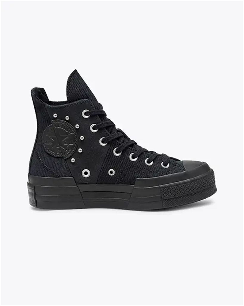 Painéis assimétricos com rebites e ilhoses metálicos trazem a iteração do Chuck 70 um visual minimalista e glamouroso. Sua pequena elevação no solado te garante conforto e destaque. Desenhado para ser fácil de combinar com qualquer look com adição de detalhes glam, estes Chucks 70 Plus vem prontos para se vestir com estilo.